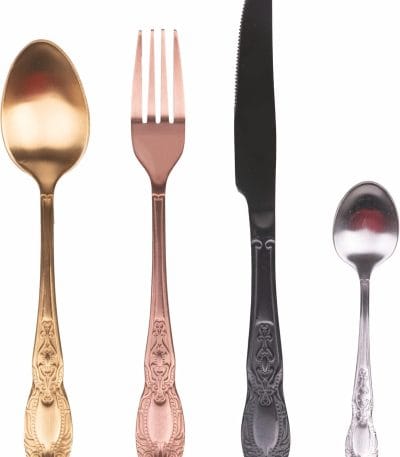 د.م. 1.650,00- Le forfait comprend 6 fourchettes, 6 cuillères, 6 couteaux et 6 cuillères à moka. Les couverts sont bien rangés dans une boîte lithographiée, parfaite également pour offrir en cadeau à qui vous voulez.