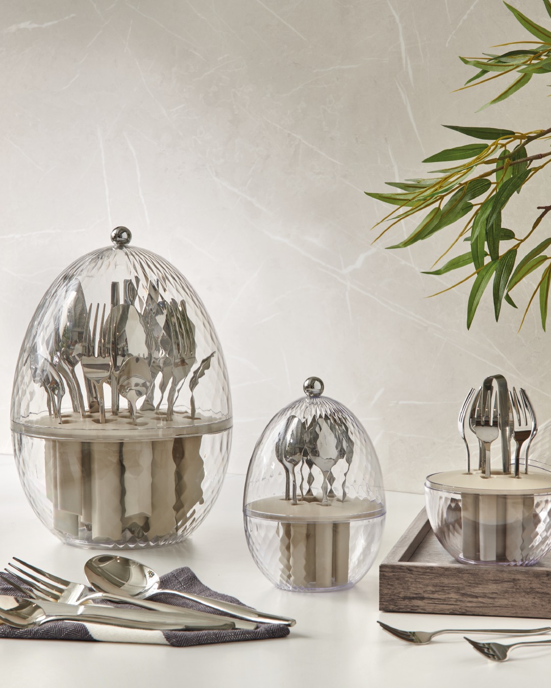 Pour un effet spectaculaire à table, découvrez l’ovetto porte-posate de Brandani. Ce accessoire unique renferme un Set 24 couverts inox Brandani pratique, toujours prêts à l’usage. Idéal pour organiser les couverts du quotidien, il s’impose aussi comme un élément décoratif élégant pour un buffet.